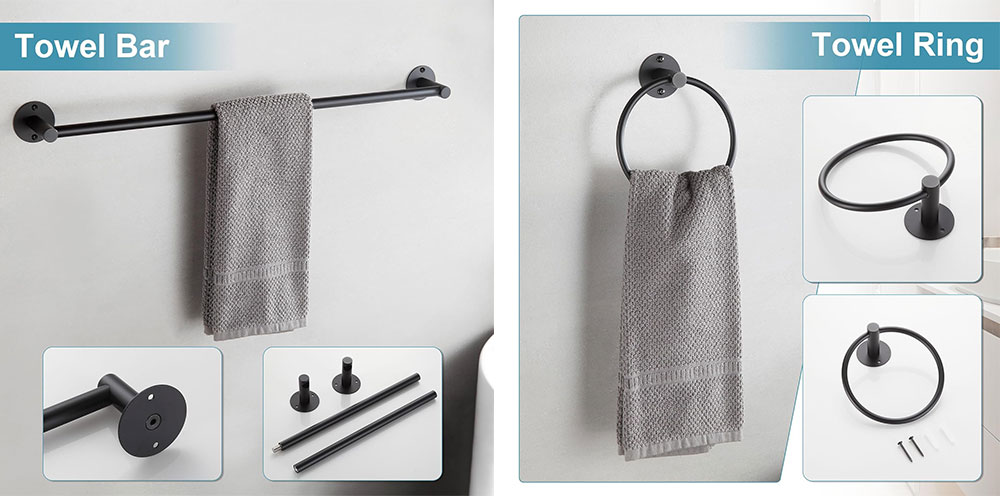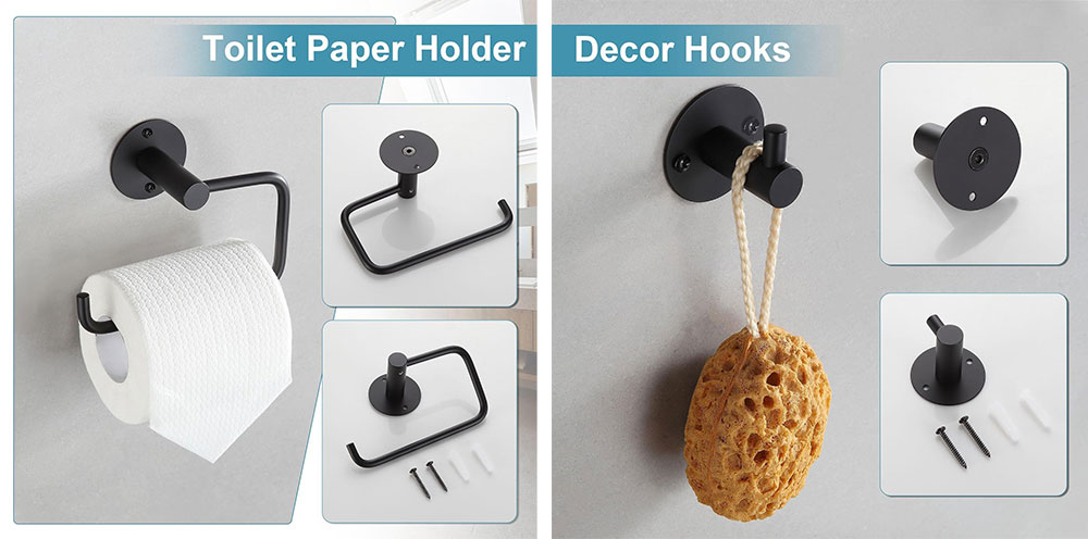 Versatile Set: Includes a towel bar, toilet paper holder, hand towel ring, and a robe hook, providing a complete bathroom hardware solution.