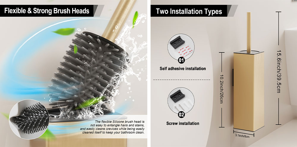 Poils résistants : La brosse est dotée de poils robustes et denses qui nettoient efficacement sans endommager la surface des toilettes, garantissant un nettoyage en profondeur à chaque fois.
