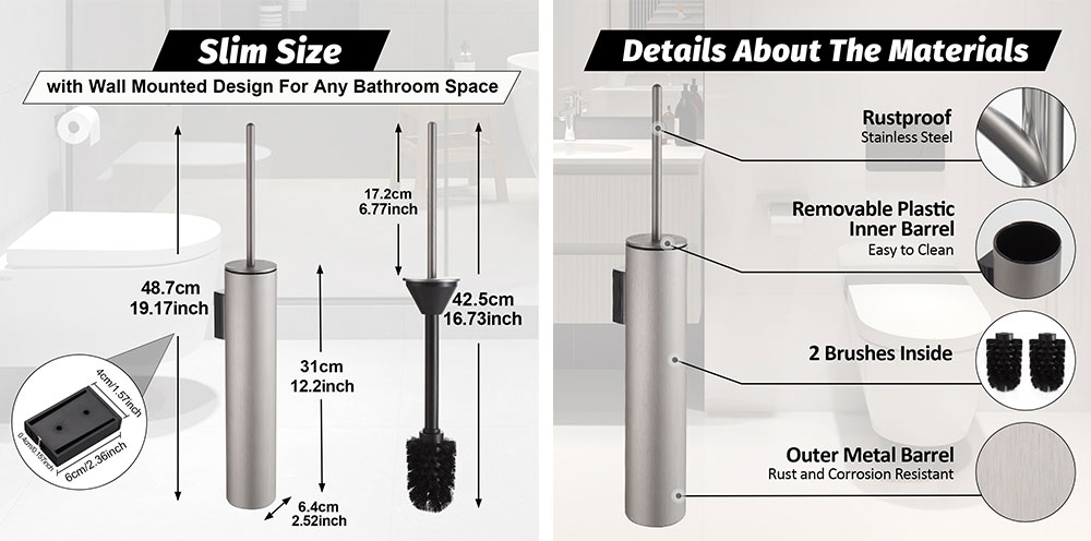 Slim and Space-Saving Design: The toilet brush holder features a slim, cylindrical design that saves space in your bathroom, making it ideal for small or compact areas.